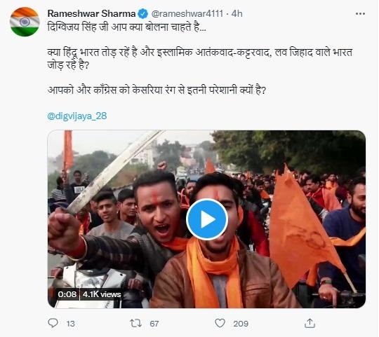 दिग्विजय सिंह जी आप क्या बोलना चाहते है… क्या हिन्दू भारत तोड़ रहे हैं और इस्लामिक आतंकवाद-कट्टरवाद, लव जिहाद वाले भारत जोड़ रहे हैं? आपको और कांग्रेस को केसरिया रंग से इतनी परेशानी क्यों है?