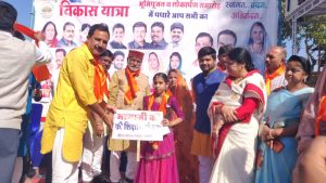 नागदा। शनिवार को वार्ड नंबर 15 से 24 तक विकास यात्रा घूमी। इस दिन 11 स्थानों पर 3 करोड़ 41 लाख 71 हजार रुपए के निर्माण कार्यों के भूमिपूजन 6 स्थानों पर कन्यापुजन व लाडली लक्ष्मी योजना सहित अन्य योजना के हितग्राहियों को स्वीकृति पत्र बांटे गए। ई-लाइब्रेरी, फ्री वाइफाई जोन का शुभारंभ किया गया। दिव्यांगजनों को उपकरण भी प्रदान किए गए। नपाध्यक्ष संतोष गेहलोत ने पाडल्या रोड चौराहा से हरी झंडी दिखाकर विकास रथ को रवाना किया। अतिथि पूर्व विधायक दिलीपसिंह शेखावत, नपा उपाध्यक्ष सुभाषचंद्र शर्मा, लालसिंह राणावत, डॉ. तेजबहादुरसिंह चौहान रहें।