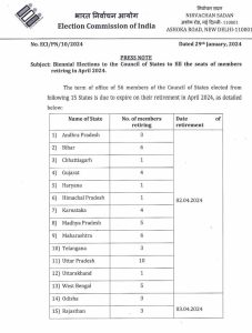 27 फरवरी को वोटिंग, उसी दिन रिजल्ट 27 फरवरी को राज्यसभा की 56 सीटों पर वोटिंग के बाद इसी दिन शाम तक नतीजे आ जाएंगे। 8 फरवरी को अधिसूचना जारी होगी, जिसके बाद केंडिडेट 15 फरवरी तक अपना नामांकन दाखिल कर सकता है। इसके बाद नामांकन पत्रों की जांच की तारीख 16 फरवरी है। वहीं 20 फरवरी तक उम्मीदवार अपना नाम वापस ले सकेंगे।