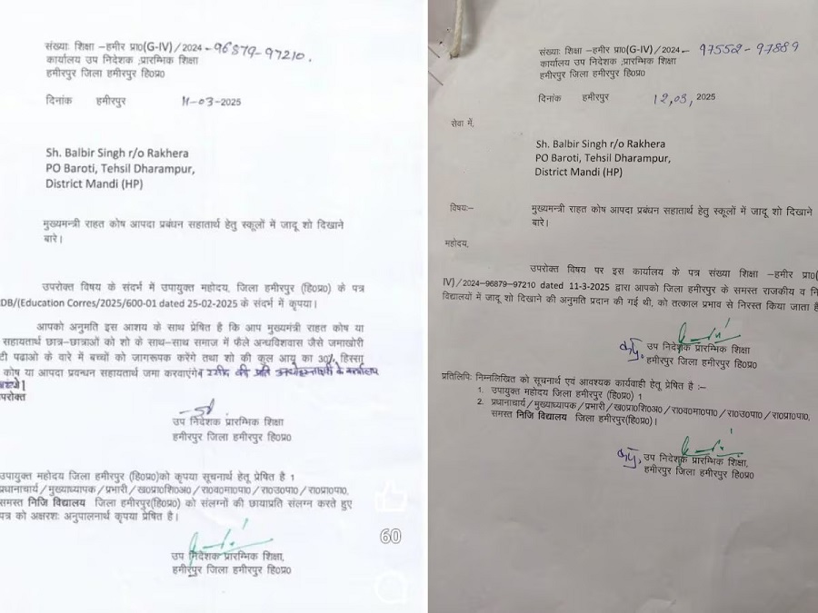 गौरतलब है कि हमीरपुर जिला शिक्षा विभाग ने 11 मार्च को जादूगर बलवीर सिंह को एक पत्र भेजा था, जिसमें कहा गया था कि वह हमीरपुर जिले के स्कूलों में मैजिक शो से होने वाली कमाई का कुछ हिस्सा सीएम रिलीफ फंड में जमा करवाएंगे. मंडी जिले के धर्मपुर के कांढापतन के पास रखेड़ा गांव के रहने वाले बलवीर सिंह को लिखे गए पत्र में शिक्षा विभाग ने कहा कि 25 फरवरी को डीसी की तरफ से एक पत्र उन्हें मिला था, उसी पत्र के अनुसार स्कूलों में बच्चों को जागरूक करने के लिए मैजिक शो होंगे. इस मैजिक शो के जरिये समाज में फैले अंधविश्वास, जमाखोरी, बेटी बचाओ बेटी पढ़ाओ के बारे में बच्चों को जागरूक किया जाएगा. हालांकि शो की कुल आय का 30 प्रतिशत हिस्सा मुख्यमंत्री राहत कोष या आपदा प्रबंधन सहायतार्थ को देना होगा. शिक्षा विभाग का यह लेटर अब जमकर वायरल हो गया है.