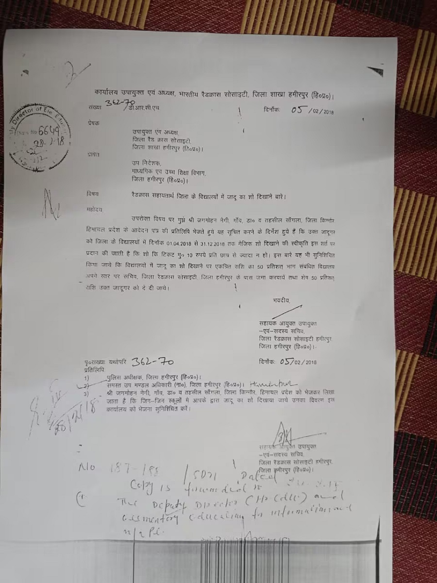 उपनिदेशक प्रारम्भिक कमल किशोर ने बताया कि उपायुक्त कार्यालय हमीरपुर से 25 फरवरी को पत्र जारी किया गया था, जिसमें मंडी जिले के धर्मपुर के कांढापतन के रखेगा गांव के जादूगर बलवीर सिंह (सम्राट बादल) ने प्रार्थना की थी कि वे स्कूलों में जादू शो करना चाहते हैं और इसकी 30 प्रतिशत कमाई को रेडक्रॉस को दी जाएगी. उन्होंने बताया कि बलवीर का जादू शो करने का उद्देश्य समाज में फैली कुरीतियों को दूर करना है, जो कि एक अच्छा उद्देश्य है. कमल किशोर ने बताया कि अपने स्तर पर ही इस पत्र को जिला के विभिन्न स्कूलों में भेजा गया है और इसके लिए न तो सरकार की ओर से और न ही शिक्षा निदेशालय शिमला से कोई आदेश आए हुए थे.