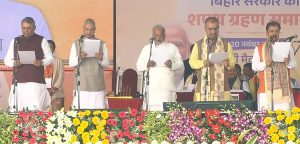 पटना. नीतीश कुमार ( Nitish Kumar) ने मुख्यमंत्री (CM) के रूप में 10वीं बार शपथ (oath) ग्रहण कर लिया है। राज्यपाल आरिफ मोहम्मद खान (Arif Mohammad Khan) ने उन्हें मुख्यमंत्री पद की शपथ दिलाई। उनके बाद सम्राट चौधरी ने मंत्री पद की शपथ ली। वह दूसरी बार बिहार के डिप्टी सीएम बने हैं।
