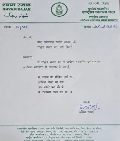 श्याम रजक ने अपना इस्तीफा देते हुए लिखा कि मैं राष्ट्रीय जनता दल के राष्ट्रीय महासचिव और दल की प्राथमिक सदस्यता से त्यागपत्र दे रहा हूं. इसके साथ ही उन्होंने एक मैसेज भी दिया, इसमें लिखा कि ”मैं शतरंज का शौकीन नहीं था, इसलिए धोखा खा गया, आप मोहरे चल रहे थे, मैं रिश्तेदारी निभा रहा था.”