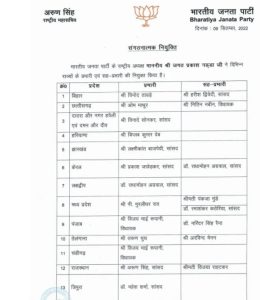 इनके अलावा बिहार के लिए विनोद तावड़े को प्रभारी नियुक्त किया गया है और सांसद हरीश द्विवेदी को सह प्रभारी बनाया गया है. दादरा और नगर हवेली एवं दमन और दीव के लिए सांसद विनोद सोनकर प्रभारी नियुक्त किए गए हैं. इनके अलावा झारखंड के लक्ष्मीकांत बाजपेई को प्रभारी बनाया गया है. जबकि केरल के लिए प्रकाश जावड़ेकर को प्रभारी और राधामोहन अग्रवाल को सह प्रभारी नियुक्त किया गया है.