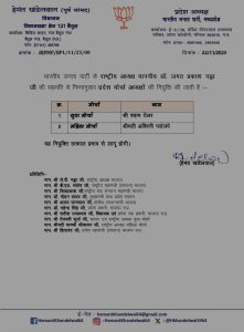भाजपा प्रदेश अध्यक्ष हेमंत खंडेलवाल द्वारा जारी आदेश के अनुसार युवा मोर्चा अध्यक्ष के रूप में श्याम टेलर व महिला मोर्चा अध्यक्ष पद की जिम्मेदारी अश्विनी परांजपे को सौंपी है। यह सभी नियुक्तियाँ तत्काल प्रभाव से लागू हो गई हैं।