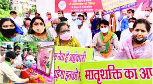 पूरे प्रदेश में जिलास्तर पर यह धरना दिया जा रहा है। आज सुबह 10 बजे से रीगल प्रतिमा स्थित बगीचे में ही धरने की शुरूआत की गई। धरने में बड़ी संख्या में महिला मोर्चा की कार्यकर्ता शामिल हुईं, जिन्होंने अपने हाथ में तख्तियां ले रखी थी। तख्तियों पर दंभ में डूबी कांग्रेस नेता है अहंकारी, मां-बहनों का अपमान पड़ेगा इनको भारी, मातृशक्ति का यह अपमान नहीं सहेगा हिन्दुस्तान जैसे नारे लिखे हुए थे। धरने में सांसद ज्योतिरादित्य सिंधिया भी शामिल हुए। हालांकि आज उन्हें सुबह ही सभा लेने ब्यावरा जाना था, लेकिन धरने में शामिल होने के कारण वे देरी से जाएंगे।