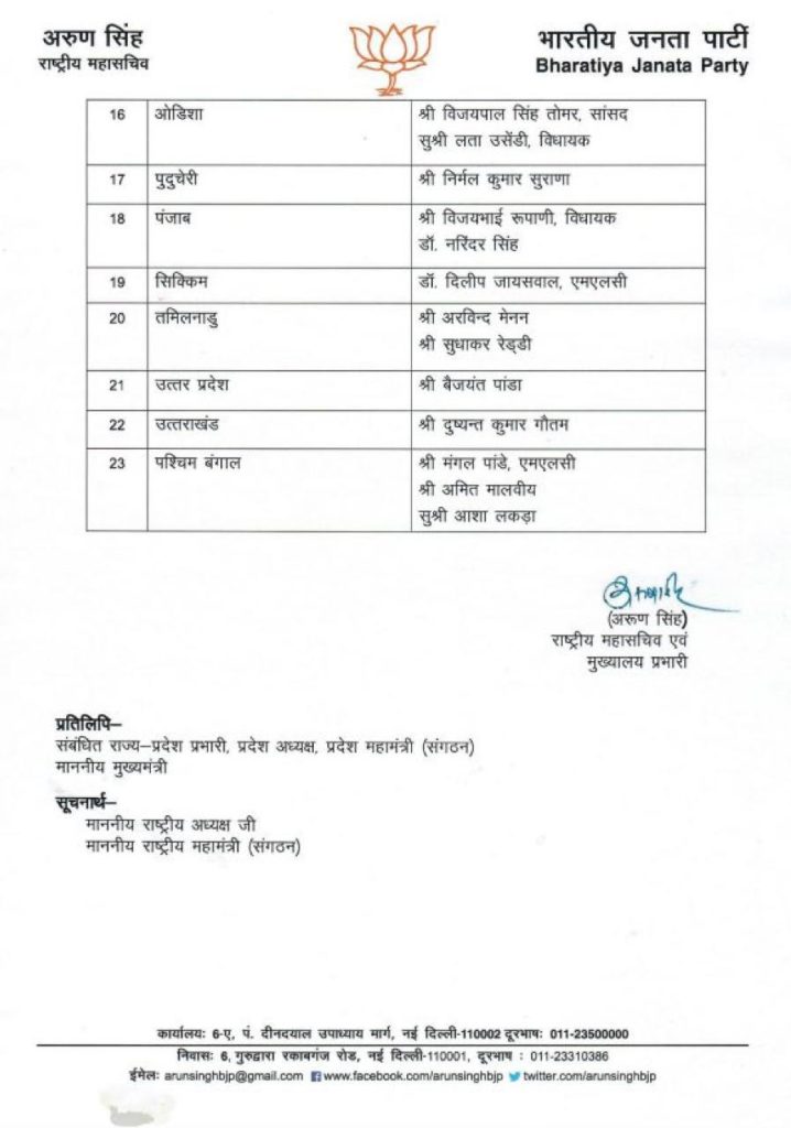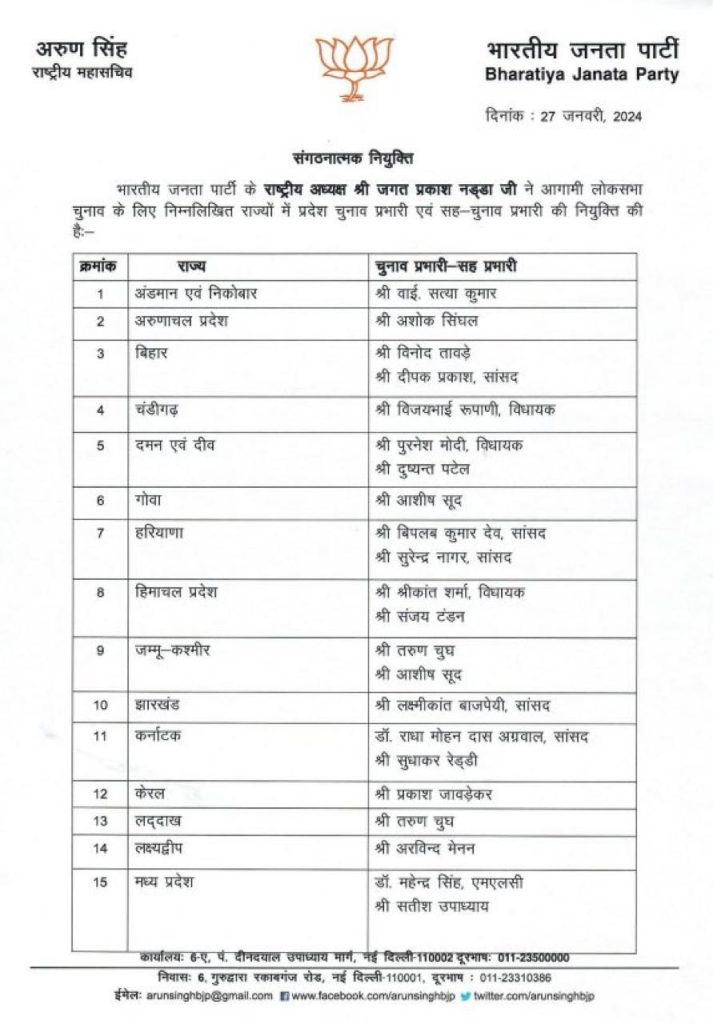 इंदौर। भारतीय जनता पार्टी (BJP) ने आगामी लोकसभा चुनाव (LokSabha Election) 2024 बड़ी जीत के लिए राज्यों में प्रदेश चुनाव प्रभारी और सह-प्रभारीयों की नियुक्ति की है। पार्टी के राष्ट्रीय अध्यक्ष जगत प्रकाश नड्डा (JP Nadda) ने इस सूची को शनिवार को जारी किया है। बीजेपी ने अपने राज्यों में नए प्रभारी के नाम का एलान किया है। मध्य प्रदेश में चुनाव प्रभारी के रूप में महेंद्र सिंह (Mahendra Singh) और सतीश उपाध्याय (Satish Upadhyay) को नियुक्त किया है।
