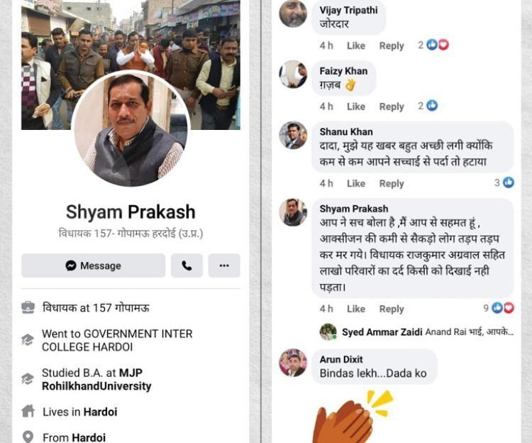 हरदोई । उत्तर प्रदेश के हरदोई जिले (Hardoi District) के गोपामऊ से बीजेपी विधायक श्याम प्रकाश (BJP MLA Shyam Prakash) ने एक बार फिर सोशल मीडिया पर एक कॉमेंट करके अपनी ही सरकार को कटघरे में खड़ा कर दिया है. रविवार को उन्होंने अपने फेसबुक पर एक पोस्ट (Facebook Post) पर कॉमेंट लिखा कि आप ने सच बोला है. मैं आप से सहमत हूं. ऑक्सीजन की कमी से सैकड़ों लोग तड़प-तड़प कर मर गए.