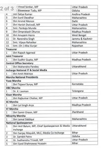 अमित मालवीय पहले की तरह नैशनल आईटी और सोशल मीडिया सेल चीफ की जिम्मेदारी निभाते रहेंगे। डॉक्टर के लक्ष्मण को ओबीसी मोर्चा, राजकुमार चाहर को किसान मोर्चा, लाल सिंह आर्य को एससी मोर्चा, समीर ओरांव को एसटी मोर्चा और जमाल सिद्दीकी को अल्पसंख्यक मोर्चा का प्रमुख बनाया गया है।