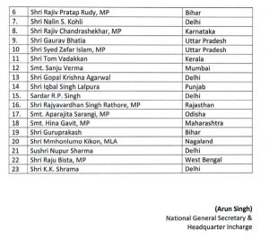 बीजेपी ने अब अपने राष्ट्रीय प्रवक्ताओं की संख्या को बढ़ाकर 23 कर दिया है। सांसद अनिल बलूनी को प्रमोट कर मुख्य प्रवक्ता बनाया गया है। वह पहले की तरह मीडिया प्रभारी की जिम्मेदारी भी निभाते रहेंगे। 8 राष्ट्रीय महासचिवों मे 5 नए चेहरे हैं। भूपेंद्र यादव, अरुण सिंह और कैलाश विजयवर्गीय नई टीम में भी महासचिव हैं। राष्ट्रीय महासचिव के तौर पर जिन 5 नए चेहरों को लाया गया है, उनमें दुष्यंत कुमार गौतम, डी. पुरंदेश्वरी, सीटी रवि, तरुण चुग औऱ दिलीप सैंकिया हैं।
