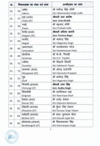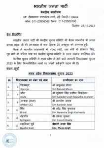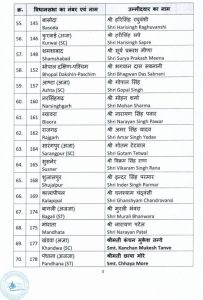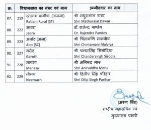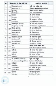 इंदौर। मध्यप्रदेश (Madhya Pradesh) विधानसभा चुनाव (assembly elections) के लिए बीजेपी (BJP) ने अपनी पांचवीं लिस्ट जारी कर दी है। इस लिस्ट में 92 विधानसभा सीटों के लिए प्रत्याशी घोषित (declared candidate) किए गए हैं। बीजेपी अब तक 228 उम्मीदवारों की घोषणा कर चुकी है। अब केवल 2 विधानसभा सीटों के लिए उम्मीदवार घोषित होने बाकि हैं। इंदौर-3 से मौजूदा विधायक आकाश विजयवर्गीय का टिकट काट दिया है। उनकी जगह राकेश शुक्ला को उम्मीदवार बनाया गया है।