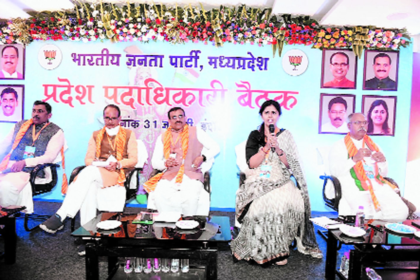 इंदौर। भारतीय जनता पार्टी पूरे भारत को एक सकारात्मक, स्वावलंबी और स्वाभिमानी राष्ट्र बनाने की दिशा में तेजी से काम कर रही है। पार्टी के कार्यकर्ताओं को इस उद्देश्य की पूर्ति के लिये अपनी निर्धारित पद्धति के साथ टीम भावना के साथ काम करने की आवश्यकता है। सबकी भाजपा और सबके लिये भाजपा के मार्ग पर चलते हुये हमें सर्वस्पर्शी और सर्व व्यापी संगठन के निर्माण के लिये दिन रात मेहनत करनी है। यह बात प्रदेश पदाधिकारियों की बैठक में प्रदेश अध्यक्ष विष्णुदत्त शर्मा ने कही। शर्मा ने कहा कि हमारे कार्यकर्ता को वर्तमान राजनैतिक-सामाजिक परिदृश्य पर अपनी भूमिका तय करनी होगी। उन क्षेत्रों पर अधिक ध्यान देना पड़ेगा, जहां अधिक काम करने की आवश्यकता है। उन्होंने कहा कि हमारे पदाधिकारी पार्टी का चेहरा हैं। और इन सभी चेहरों को एकजुट होकर समाज और देश विरोधी ताकतों के प्रयासों का करारा जवाब देना है। शिवराज सिंह चौहान ने कहा कि पार्टी पदाधिकारी के नाते हम महत्वपूर्ण हैं, लेकिन यह महत्व काम के लिये है। उन्होंने कहा कि भाजपा का कार्यकर्ता अहंकार से परे, आत्मविश्वास से भरकर काम करता है और यही कारण है कि साधारण सा दिखने वाला हमारा कार्यकर्ता असाधारण परिणाम लेकर उपस्थित होता है। प्रधानमंत्री श्री नरेन्द्र मोदी जी का जीवन इस बात का ठोस प्रमाण है। मुख्यमंत्री ने इस अवसर पर युवा मोर्चा के समय की अपनी टीम का स्मरण करते हुये कहा कि उस समय के जुझारू नेता आज देशभर में विचार का परचम फरहा रहे हैं। उन्होंने कहा कि हम भारत के गौरव के निर्माण का काम कर रहे हैं।