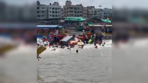 मुंबई। मुंबई के वर्सोवा बीच पर रविवार को अंधेरी के राजा का विसर्जन हो रहा था। इसी दौरान अचानक नाव पलटने के चलते मंडल के कुछ कार्यकर्ता और अन्य लोग पानी के अंदर गिर गए। जानकारी के मुताबिक, रविवार सुबह 11:00 बजे मूर्ति का विसर्जन किया जा रहा था। तभी नाव पलट गई। नाव पलटते ही वहां अफरा-तफरी मच गई। नाव में सवार दो दर्जन से अधिक लोग समुद्र की लहरों के बीच जा गिरे। वहां मौजूद लोग पानी में डूबे लोगों को बचाने लगे। हालांकि, इस घटना में किसी के भी हताहत होने की कोई खबर नहीं है। समय रहते एक बड़ा हादसा होने से टल गया।