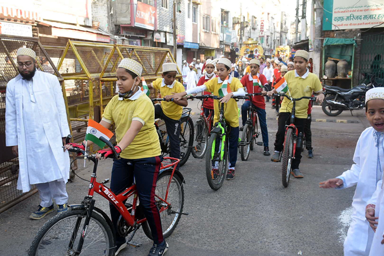उज्जैन। बोहरा समाज के 53 वें धर्मगुरू डॉ. सैयदना आलीकदर मुफद्दल सैफुद्दीन के जन्म दिन के अवसर पर आज सुबह कमरी मार्ग रोजे से चल समारोह निकाला गया। जिसमें शामिल बोहरा समाजजनों एवं स्कूली बच्चों ने देश भक्ति व स्वच्छता का संदेश दिया। जुलूस नगर के विभिन्न मार्गों से निकला। इस दौरान शहर आमिल के प्रतिनिधि शेख इब्राहिम भाई साबिर के साथ बोहरा समाजजन सफेद लिबास में अमन का पैगाम देते चल रहे थे। बग्गी में बैठे बच्चे एवं घोड़े पर बैठे समाजजन हाथों में तख्तियों लेकर कोई वतन से मोहब्बत तो कोई स्वच्छता का संदेश दे रहा था। तैयबी स्कूल के बच्चों ने जुलूस में चलते-चलते समाजजनों को बताया कि पर्यावरण में तेजी से घुल रहा धुआ फेंफड़ों को खराब कर रहा है, इसलिए पेट्रोल-डीजल वाले वाहन कम चलाएं, साइकिल का अधिक से अधिक उपयोग करें। यह संदेश स्कूल के बच्चों ने साइकिल रैली निकालकर शहर की जनता को दिया। फिटनेस के बारे में बताया कि योग की जीवन में क्या उपयोगिता है जीवन दूसरों के भी काम आए, इसी तरह जीना चाहिए।