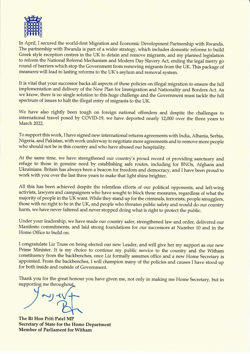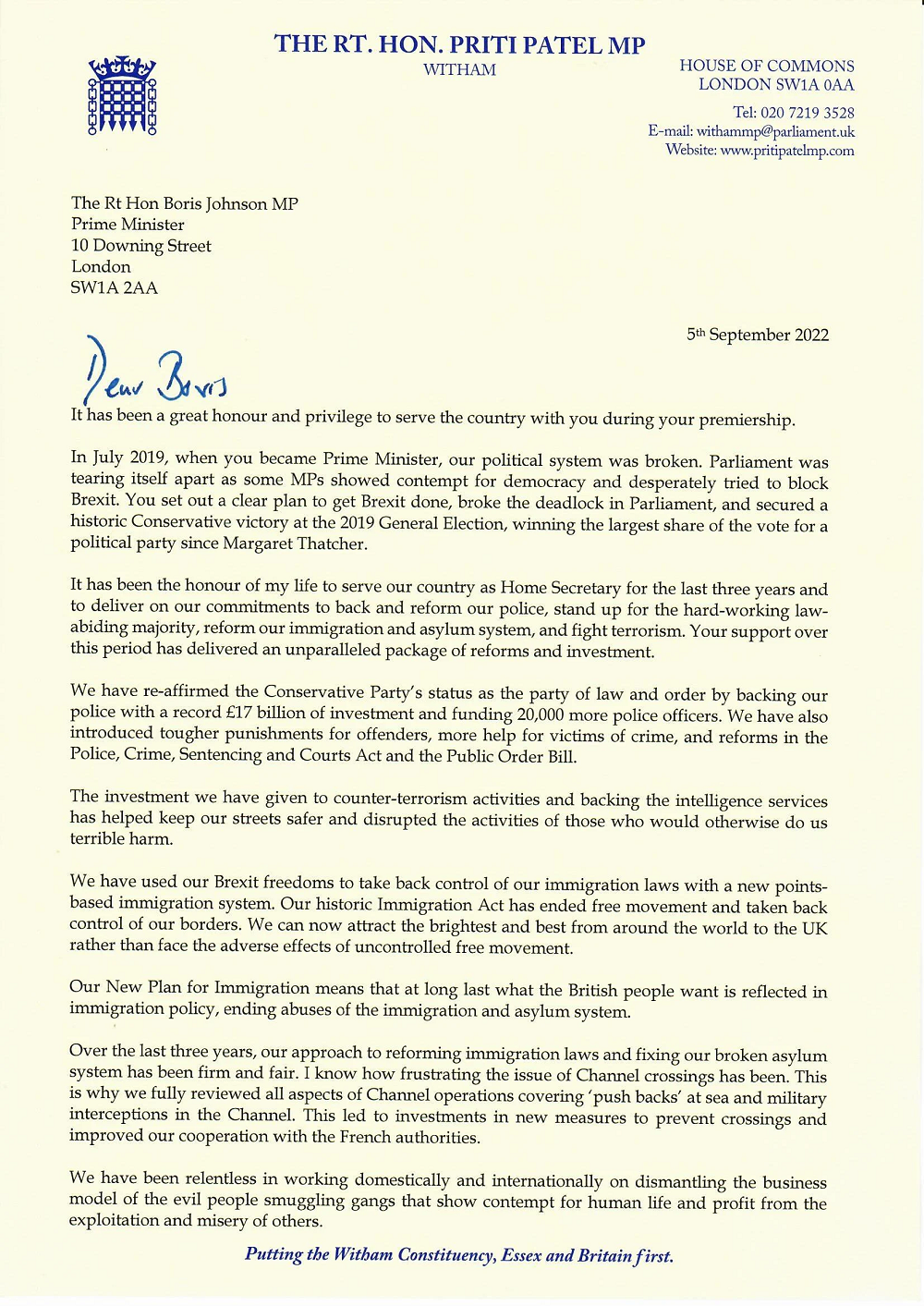 प्रीति पटेल ने वर्तमान प्रधानमंत्री बोरिस जॉनसन (Prime Minister Boris Johnson) को दिए अपने त्याग पत्र में कहा कि मैं लिज ट्रस को हमारा नया नेता चुने जाने पर बधाई देती हूं और उन्हें अपना नया प्रधानमंत्री के रूप में अपना समर्थन देती हूं। लिज के औपचारिक रूप से पद ग्रहण करने और एक नए गृह मंत्री की नियुक्ति के बाद मैं बैकबेंच से देश और विटहैम निर्वाचन क्षेत्र के लिए अपनी सार्वजनिक सेवा जारी रखना पसंद करूंगी।