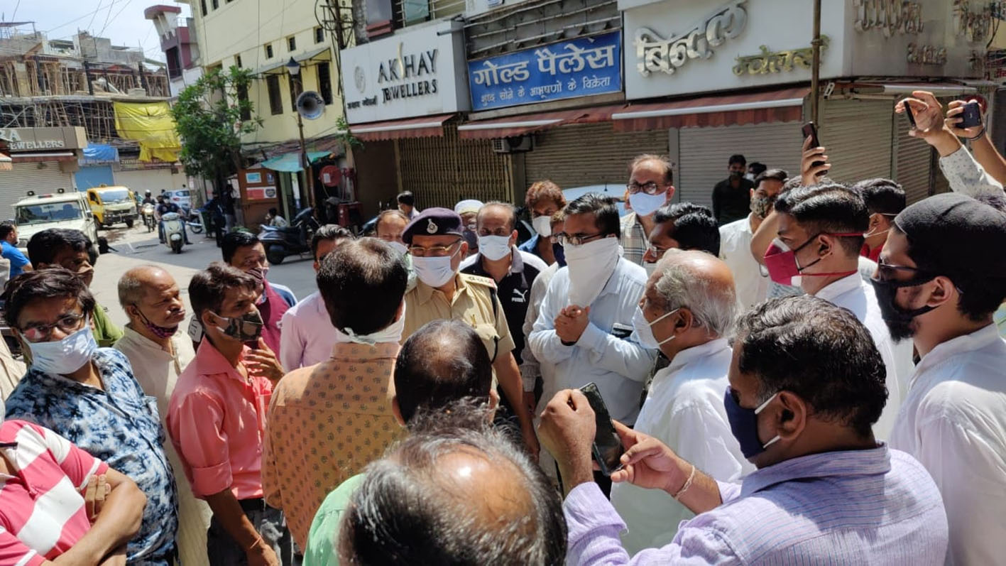 भोपाल। राजधानी के पुराने भोपाल (Old Bhopal) में स्थित चौक बाजार (Chowk Bazar) को पूरी तरह से खोलने की मांग को लेकर सर्राफ कारोबारियों सहित तमाम व्यवसायिक संगठन एक जुट होकर अपनी दुकानों के बाहर प्रर्दशन कर रहे हैं। सोमवार की सुबह व्यापारियों ने चौकी तलैया को घेर लिया था। जिसके बाद में पुलिस (Police) के आला अधिकारी मौके पर पहुंचे और व्यापारियों को समझाइश दी। हालांकि व्यापारियों की मांग थी की कलेक्टर (Collector) चौक आए और उन्हीं को ज्ञापन सौंपा जाएगा। चौकी घेरने के बाद सभी व्यापारियों ने सोशल डिस्टेंसिंग (Social Distancing) का पालन करते हुए अपनी दुकानों के बाहर खड़े होकर विरोध प्रदर्शन किया।