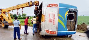– दो की मौत, 30 से अधिक घायल,ड्राइवर को झपकी लगने के कारण आधी रात में हुई घटना