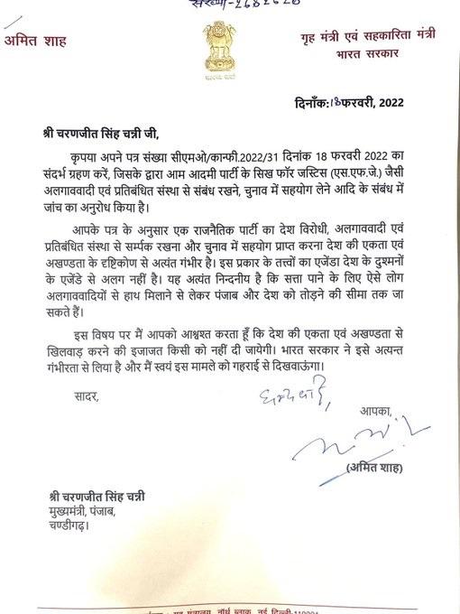 गृहमंत्री अमित शाह ने CM चन्नी को लिखा है, ”एक राजनीतिक पार्टी का देश विरोधी, अलगाववादी और प्रतिबंधित संस्था से संपर्क रखना और चुनाव में सहयोग प्राप्त करना देश की अखंडता के दृष्टिकोण से अत्यंत गंभीर है. इस प्रकार के तत्वों का एजेंडा देश के दुश्मनों के एजेंडे से अलग नहीं है. यह अत्यंत निंदनीय है कि सत्ता पाने के लिए ऐसे लोग अलगाववादियों से हाथ मिलाने से लेकर पंजाब और देश को तोड़ने की सीमा तक जा सकते हैं.”