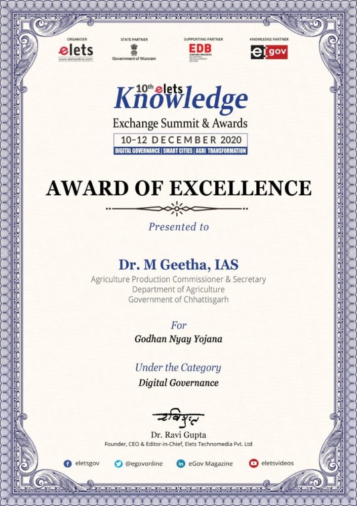 रायपुर । छत्तीसगढ़ में कृषि विभाग द्वारा संचालित गोधन न्याय योजना के लिए चिप्स द्वारा विकसित वेबसाइट और मोबाइल एप को राष्ट्रीय स्तर पर पुरस्कार मिला है। देश की ख्याति प्राप्त आई.टी. संस्था एलेट्स टेक्नोमिडिया ने डिजिटल गवर्नेंस श्रेणी में गोधन न्याय योजना को वर्चुअल समारोह में “अवार्ड आफ एक्सीलेंस” प्रदान किया है। वर्चुअल समारोह में छत्तीसगढ़ की कृषि उत्पादन आयुक्त एवं सचिव कृषि विभाग डॉ. एम. गीता सम्मानित किया गया।