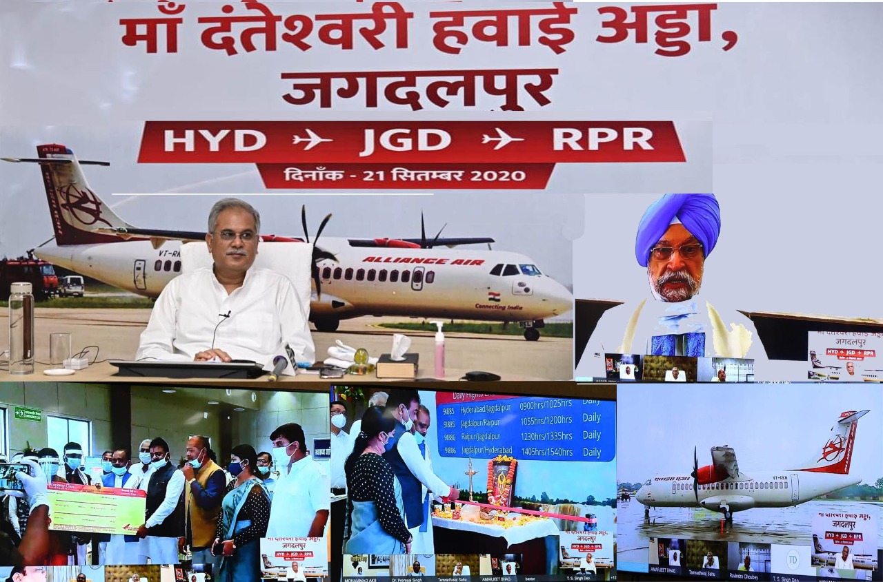 रायपुर । छत्‍तीसगढ़ के मुख्यमंत्री भूपेश बघेल ने सोमवार को यहां अपने निवास कार्यालय से बस्तर जगदलपुर से रायपुर एवं हैदराबाद की हवाई यात्रा के लिए 72 सीटर नियमित विमान सेवा का वर्चुअल शुभारंभ किया। जगदलपुर स्थित मां दंतेश्वरी एयरपोर्ट से अब बस्तरवासियों को हवाई मार्ग से रायपुर एवं हैदराबाद आवागमन की सुविधा का लाभ मिलेगा। विमान सेवा के शुभारंभ अवसर पर छत्तीसगढ़ शासन के मंत्रीगण, सांसद, संसदीय सचिव, विधायकगण सहित बस्तर अंचल के जनप्रतिनिधि एवं वरिष्ठ प्रशासनिक अधिकारी वीडियो कॉन्फ्रेंसिंग के माध्यम से शामिल हुए।