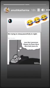 अब अगर आप ये सोच रहे हैं कि इससे अनुष्का शर्मा (Anushka Sharma) को क्या लेना देना है, तो आपको कि हाल ही में उन्होंने अपनी इंस्टा स्टोरी पर एक मीम शेयर किया है जिसके जरिए उन्होंने बताया है कि ये गाना उनके भी दिमाग पर चढ़ चुका है. इस मीम में अनुष्का (Anushka Sharma) ने दिखाया है कि एक शख्स रात को जब सुकून से सोने जा रहा है तो भी उसके दिमाग में यही गाना चल रहा होता है.
