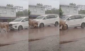 During this time, when he was going from the airport to his in-laws’ house in Sundar Nagar by road with his convoy, a running cow collided with a car in his convoy. In the viral video, a policeman is seen standing on the road for security. But he too could not do anything because the cow suddenly entered the convoy from the other end of the road. It was a good coincidence that a major accident did not happen.