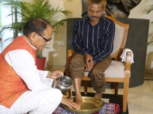मुख्यमंत्री शिवराज सिंह चौहान ने सीधी की घटना को लेकर पीड़ित परिवार से मुलाकात की और दुख जताया. सीएम ने पीड़ित दशमत रावत के पेर धोकर उनका सम्मान किया. मुख्यमंत्री ने पीड़ित परिवार से कहा कि घटना को लेकर उनका मन दुखी है. मुलाकात के बाद सीएम शिवराज के साथ दशमत सीएम हाउस से रवाना हुए. दोनों एक ही गाड़ी में पौधारोपण कार्यक्रम के लिए निकले. मुख्यमंत्री ने दशमत रावत के साथ पौधा भी लगाया.