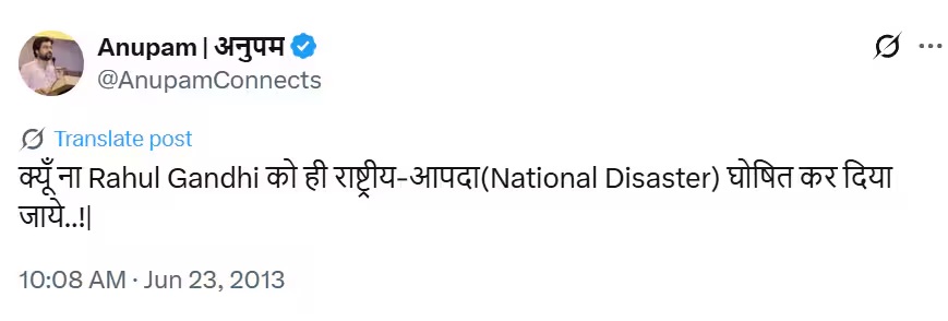 जून 2023 के इस पोस्ट में अनुपम सवाल पूछते हुए देखे जा रहे हैं, जिसमें वह लिखते हैं, “क्यूं न राहुल गांधी को ही राष्ट्रीय आपदा घोषित कर दिया जाए।” अनुपम के इस पोस्ट पर अभी तक पार्टी की कोई प्रतिक्रिया सामने नहीं आई है। अनुपम के सोशल मीडिया हैंडल से अब उस पोस्ट को हटा दिया गया है।