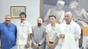 नई दिल्ली: लद्दाख के निर्दलीय सांसद मोहम्मद हनीफा जान ने मंगलवार (11 जून) को कांग्रेस अध्यक्ष मल्लिकार्जुन खरगे से मुलाकात की है. कांग्रेस की तरफ से हनीफा और खरगे की तस्वीर ऑफिशियल एक्स हैंडल पर शेयर की गई है. इस तस्वीर में कांग्रेस महासचिव केसी वेणुगोपाल भी नजर आ रहे हैं. हनीफा और खरगे की मुलाकात के बाद राजनीतिक गलियारों में चर्चा शुरू हो गई है कि कहीं लद्दाख के निर्दलीय सांसद हनीफा कांग्रेस का हाथ तो नहीं थामने वाले हैं.