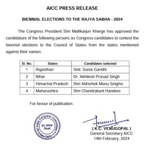 डॉ. अखिलेश प्रसाद सिंह को बिहार से राज्यसभा का टिकट दिया गया है। वहीं अभिषेक मनु सिंघवी को हिमाचल से कांग्रेस पार्टी ने राज्यसभा का उम्मीदवार घोषित किया है। महाराष्ट्र से चंद्रकांत हंदोरे को टिकट मिला है। पिछली बार चंद्रकांत हंडोरे को विधान परिषद में टिकट मिला था लेकिन वो चुनाव हार गए थे।