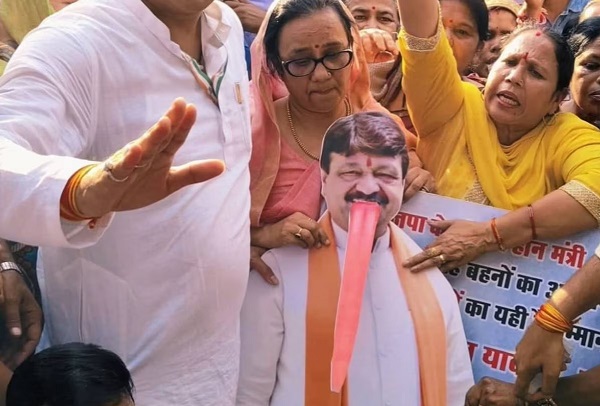 मध्य प्रदेश की भाजपा सरकार में नगरीय प्रशासन मंत्री कैलाश विजयवर्गीय के राहुल गांधी और प्रियंका गांधी को लेकर दिए गए बयान के विरोध में शुक्रवार को कांग्रेस ने राज्य के कई जगहों पर प्रदर्शन कर उनका पुतला जलाया गया। इस दौरान जिला कांग्रेस कमेटी भोपाल शहर ने अनोखा प्रदर्शन किया। जिला अध्यक्ष प्रवीण सक्सेना के नेतृत्व में कांग्रेस कार्यकर्ताओं ने मंत्री कैलाश विजयवर्गीय के बंगले का घेराव किया।