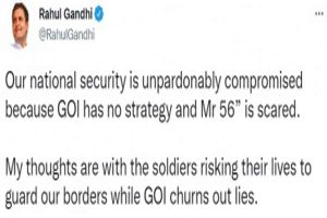 कांग्रेस नेता राहुल गांधी ने शुक्रवार को कहा, “हमारी राष्ट्रीय सुरक्षा से अनुचित रूप से समझौता किया गया है, क्योंकि भारत सरकार के पास कोई रणनीति नहीं है और मिस्टर 56 डरे हुए हैं। मेरे विचार सैनिकों के साथ हैं जो हमारी सीमाओं की रक्षा के लिए अपनी जान जोखिम में डालते हैं।”