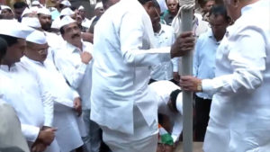 Actually, CM Siddaramaiah had come to Gandhi Bhavan on Wednesday morning to pay homage to Mahatma Gandhi on his birth anniversary. A worker present on the spot is seen helping Siddaramaiah to take off his shoes. Meanwhile, the worker has the tricolour in his hand and it is hitting the ground. Seeing this, another person removed the flag from the worker’s hands and took it in his hand.