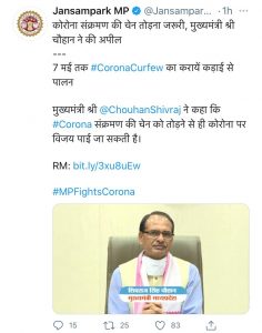इसलिए गरीब परिवार से आने लोगों को 2 महीने का राशन केंद्र सरकार की तरफ से, जबकि तीन माह का राशन मध्य प्रदेश सरकार की तरफ से नि:शुल्क बितरित किया जा रहा है। ऐसे में मेरी लोगों से अपील है कि वे कोरोना कर्फ्यू का पालन करें, ताकि संक्रमण की चेन को तोड़ा जा सके।