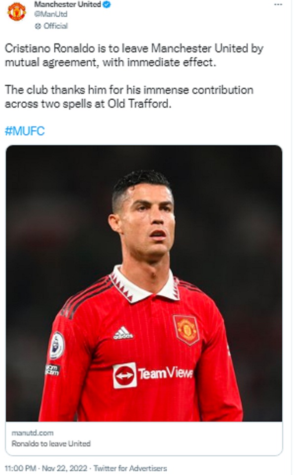 अपने बयान में मैनचेस्टर यूनाइटेड ने कहा, ”क्रिस्टियानो रोनाल्डो तत्काल प्रभाव से आपसी समझौते से मैनचेस्टर यूनाइटेड छोड़ रहे हैं। क्लब ने उन्हें ओल्ड ट्रैफर्ड में दो स्पेल में उनके अपार योगदान के लिए धन्यवाद दिया है। रोनाल्डो ने 346 मैचों में टीम के लिए 145 गोल किए। उन्हें और उनके परिवार को भविष्य के लिए शुभकामनाएं दीं।”