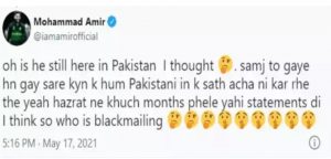 मोहम्मद आमिर (Mohammad Amir) अपने ट्विटर हैंडल एक ट्वीट किया है। जिसमें उन्होंने कहा, ‘ओह, क्या वह अब भी पाकिस्तान में है। समझ तो गए होंगे सारे कि हम पाकिस्तानी उसके साथ अच्छा नहीं कर रहे थे। तभी इस जनाब ने कुछ महीने पहले ऐसा बयान दिया था। इसलिए मुझे लगता है कि कौन ब्लैकमेलिंग कर रहा है’।
