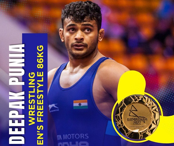 बर्मिंघम। राष्ट्रमंडल खेल 2022 (Birmingham Commonwealth Games 2022) के आठवें दिन यानी शुक्रवार को भारतीय पहलवानों (Indian wrestlers) का दबदबा रहा। भारत के उभरते पहलवान दीपक पूनिया (wrestler Deepak Poonia) ने पुरुषों के 86 किग्रा वर्ग फ्रीस्टाइल में पाकिस्तान (Pakistan) के मोहम्मद इनाम (Mohammad Inam) को 3-0 से हराकर भारत को नौवां स्वर्ण पदक दिलाया। इसके साथ उन्होंने राष्ट्रमंडल खेलों में पहला स्वर्ण पदक अपने नाम किया।