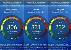 दिल्ली में बुधवार सुबह का AQI 306 दर्ज किया गया। नजदीकी नोएडा में हवा की क्वालिटी और खराब हो गई है। वहां का AQI 331 है। इन दोनों के मुकाबले गुड़गांव की स्थिति अभी ठीक है। वहां AQI 232 है। मंगलवार को दिल्ली में 304 AQI दर्ज किया गया था। इस वक्त दिल्ली का जो AQI है, वह पिछले साल से भी खराब है। अनुमान के मुताबिक, अगले दो दिन AQI के ‘बहुत खराब’ से ‘खराब’ के बीच रहेगा। दिल्ली में हवा भी न के बराबर चल रही है जिससे लोकल पॉल्युटेंट्स फंस जा रहे हैं।