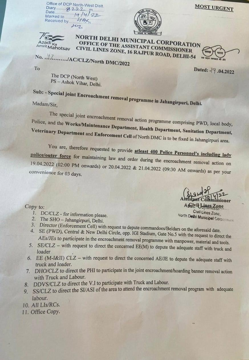 उत्तरी दिल्ली नगर निगम की ओर से इस संबंध में नॉर्थ वेस्ट के डिप्टी पुलिस कमिश्नर (डीसीपी) को पत्र लिखकर कानून व्यवस्था संभालने के लिए दिल्ली पुलिस के 400 जवानों को तैनात करने की मांग की है। उत्तरी दिल्ली नगर निगम की ओर से कहा गया है कि जहांगीरपुरी इलाके में अवैध निर्माण ध्वस्त करने के लिए 20 और 21 अप्रैल को अभियान चलाया जाएगा।