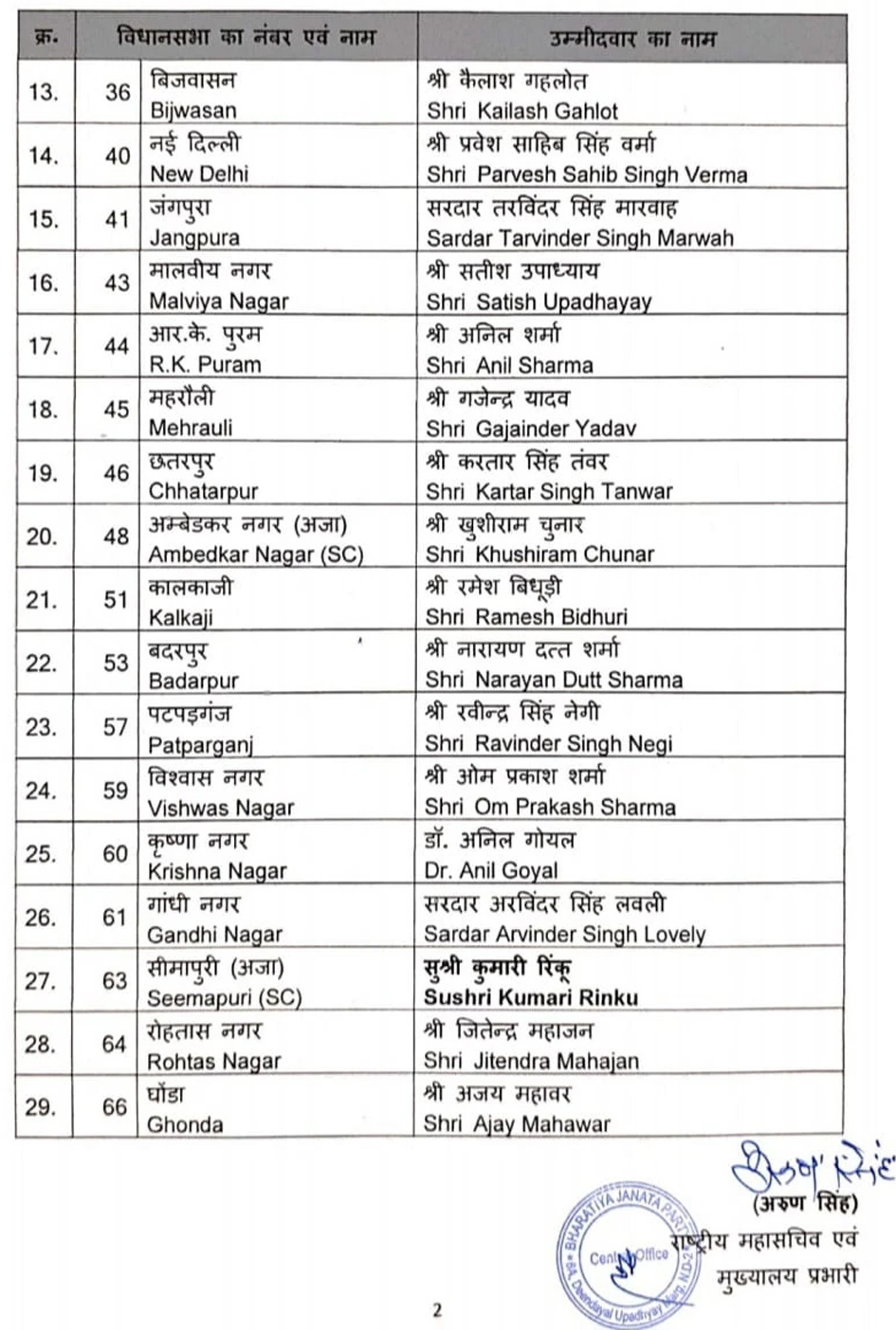 इसके साथ ही नई दिल्ली से प्रवेश साहिब सिंह वर्मा, जंगपुरा से सरदार तरविंदर सिंह, मालवीय नगर से सतीश उपाध्याय, आरके पुरम सीट से अनिल शर्मा, महरौली से गजेंद्र यादव, छतरपुर से करतार सिंह तंवर, अंबेडकर नगर से खुशीराम चुनार, कालकाजी से रमेश बिधूड़ी, बदरपुर में नारायण दत्त शर्मा, पटपड़गंज से रवींद्र सिंह नेगी, विश्वास नगर से ओम प्रकाश वर्मा, कृष्णा नगर से अनिल गोयल, गांधीनगर से अरविंदर सिंह लवली, सीमापुरी से कुमारी रिंकू, रोहतास नगर से जितेंद्र महाजन और घोंडा से अजय महावर को चुनावी मैदान में उतारा गया है.