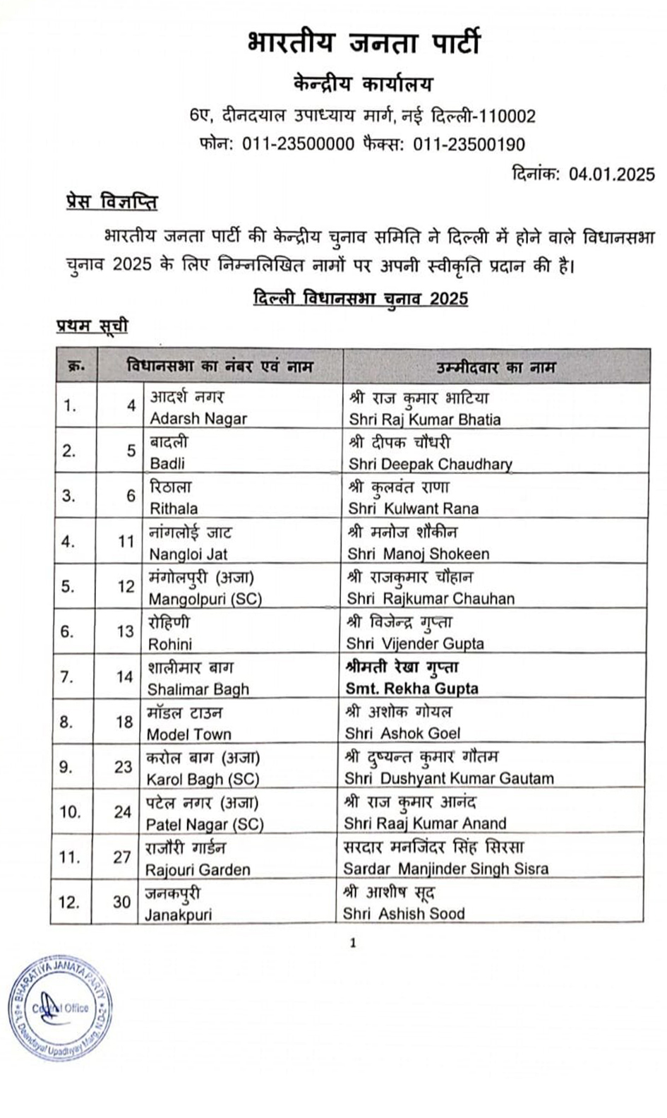 बीजेपी ने आदर्श नगर सीट से राजकुमार भाटिया, बादली से दीपक चौधरी, रिठाला से कुलवंत राणा, नांगलोई जाट से मनोज शौकीन, मंगोलपुरी सीट से राजकुमार चौहान, रोहिणी से विजेंद्र गुप्ता, शालीार बाग से रेखा गुप्ता, मॉडल टाउन से अशोक गोयल, करोल बाग से दुष्यंत कुमार गौतम, पटेल नगर से राजकुमार आनंद, राजौरी गार्डन से सरदार मनजिंदर सिंह सिरसा, जनकपुरी से आशीष सूद, बिजवासन सीट से कैलाश गहलोत को टिकट दिया है.