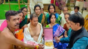 उज्जैन। मध्यप्रदेश के उज्जैन (Ujjain) के महाकालेश्वर मंदिर (Mahakaleshwar Temple) में तेलंगाना के हैदराबाद (Hyderabad, Telangana) से आए भक्त वेदुल सीताराम शर्मा ने 151.600 ग्राम 10 लाख 62 हजार 500 रुपये कीमत का सोने का हार भगवान को अर्पित किया। इसे महाकालेश्वर मंदिर प्रबंध समिति (Mahakaleshwar Temple Management Committee) के सहायक प्रशासनिक अधिकारी आरपी गहलोत (Assistant Administrative Officer RP Gehlot) द्वारा प्राप्त कर दानदाता को विधिवत रसीद प्रदान कर उसका सम्मान किया गया।