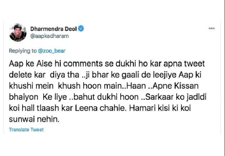 दरअसल, धर्मेंद्र ने अपने ट्विटर अकाउंट से ट्वीट करते हुए लिखा था, ‘सरकार से प्रार्थना है… किसान भाइयों की परेशानियों का कोई हल जल्दी तलाश कर लें। कोरोना के केस दिल्ली में बढ़ते जा रहे हैं… ये दुखद है।’ इस ट्वीट को कुछ देर उन्होंने डिलीट कर दिया लेकिन तब तक कई लोगों ने इसका स्क्रीन शॉट ले लिया था।