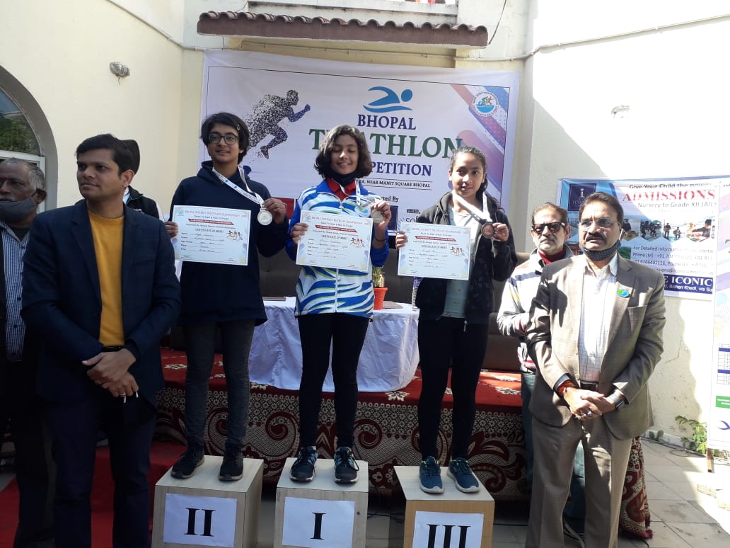 भोपाल। मप्र खेल और युवा कल्याण विभाग द्वारा संचालित ट्रायथलॉन अकादमी के खिलाड़ियों ने रिवेरा स्विमिंग पूल भोपाल में आयोजित जिला ट्रायथलॉन प्रतियोगिता में तीन स्वर्ण, दो रजत एवं एक कांस्य सहित 6 पदक अर्जित किए। खेल और युवा कल्याण संचालक पवन जैन के मुख्य आतिथ्य में आयोजित समापन समारोह में पदक विजेता खिलाड़ियों को मैडल प्रदान कर पुरस्कृत किया गया।