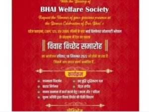 भोपाल। मध्यप्रदेश के भोपाल (Bhopal of Madhya Pradesh) में एक अलग ही आयोजन होने जा रहा है। दावा किया जा रहा है कि देश का पहला तलाक उत्सव (divorce celebration) है। इसमें डायवोर्स डिक्री प्राप्त (get divorce decree) करने वाले 18 पुरुष और उनके परिजन शामिल होंगे। भोपाल की भाई वेलफेयर सोसायटी (Bhai Welfare Society) 18 सितंबर को तलाक उत्सव का आयोजन कर रही है। 5 से 10 साल की लंबी लड़ाई के बाद मिले तलाक की खुशी मनाने के लिए कार्ड छपवाकर मेहमानों को बुलाया जा रहा है। इसका कार्ड वायरल हो गया है। भाई वेलफेयर सोसायटी के अध्यक्ष जकी अहमद ने बताया कि इस कार्यक्रम का उद्देश्य लोगों को पुरानी जिंदगी से बाहर निकालकर नई जिंदगी में आगे बढ़ाना है।