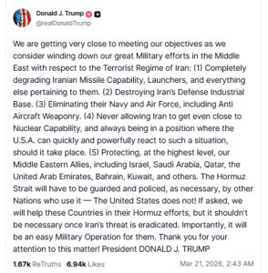 • ट्रंप ने अपनी पोस्ट में उन उपलब्धियों को गिनाया जिन्हें वे जीत का आधार मान रहे हैं’ उन्होंने कहा, ‘हमने ईरान की मिसाइल क्षमता, रक्षा औद्योगिक आधार, नौसेना और वायुसेना को पूरी तरह से नष्ट कर दिया है’ ट्रंप ने यह भी स्पष्ट किया कि अमेरिका यह सुनिश्चित करेगा कि ईरान कभी भी परमाणु हथियारों के करीब न पहुंच सके.’