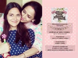 इंस्टा स्टोरी पर अहाना ने एक ग्रीटिंग कार्ड जारी किया है। इसमें उन्होंने लिखा है- कभी-कभी मिरेकल्स पेयर में होता है। हमें ये बताते हुए खुशी हो रही है कि घर में Astraia & Adea Vohra नाम की दो बेटियों का आगमन हुआ है। जन्म 26 नवंबर, 2020 को हुआ। इसी के साथ अहाना ने घर के सभी सदस्यों के बारे में बताया कि वे कैसा महसूस कर रहे हैं। पेरेंट्स वैभव वोहरा और अहाना प्राउड फील कर रहे हैं। भाई डेरिअन वोहरा उत्सुक हैं। साथ ही ग्रैंडपेरेंट्स धर्मेंद्र और हेमा मालिना ओवरजॉएड हैं।