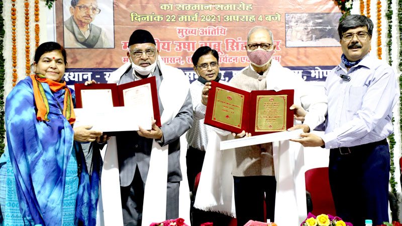 भोपाल। मध्यप्रदेश की राजधानी भोपाल के राज्य पुरातत्व संग्रहालय के सभागार में सोमवार को डॉ. विष्णु श्रीधर वाकणकर (Dr. Vishnu Sridhar Wakankar) राष्ट्रीय सम्मान (National Award) समारोह का आयोजन किया गया जिसमें प्रदेश की संस्कृति मंत्री उषा ठाकुर ने प्रो. गिरिराज कुमार और प्रो. वीएच सोनवणे (Prof. Giriraj Kumar and Prof. VH Sonawane) को डॉ. विष्णु श्रीधर वाकणकर राष्ट्रीय सम्मान (Dr. Vishnu Sridhar Wakankar National Award ) से सम्मानित किया।