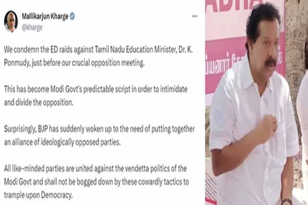 • तमिलनाडु के उच्च शिक्षा मंत्री के. पोनमुडी से जुड़े परिसरों पर ईडी की छापेमारी की निंदा की मल्लिकार्जुन खड़गे ने