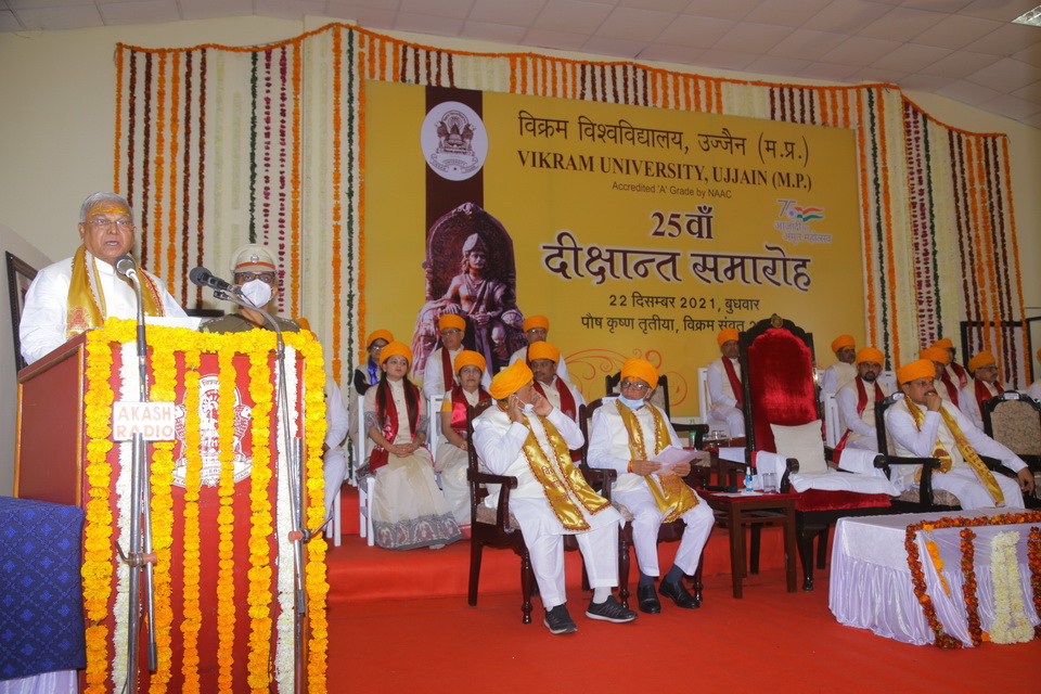 उज्जैन । विक्रम विश्वविद्यालय के 25वे दीक्षान्त समारोह में कुलाधिपति राज्यपाल मंगुभाई पटेल ने कहा कि विद्यार्थियों के हाथ में आज उपाधि पत्र ही नहीं, इसमें देश के नागरिकों की आकांक्षाएं भरी हुई हैं। उन्होंने कहा कि उपाधि प्राप्त करने के लिये सीखने के लिये सदैव उत्सुक रहना चाहिये। शिक्षा केवल जीवन यापन के लिये कौशल ही नहीं, अपितु आदर्श गुणों का विकास भी करती है। विद्यार्थियों को बदलती हुई परिस्थितियों से सामंजस्य स्थापित कर आगे बढ़ना है। राज्यपाल ने कहा कि देश के प्रधानमंत्री नरेन्द्र मोदी ने नई शिक्षा नीति को लागू किया है। यह प्रसन्नता का विषय है कि मध्य प्रदेश में विक्रम विश्वविद्यालय द्वारा प्रदेश में सर्वप्रथम राष्ट्रीय शिक्षा नीति को अंगीकृत किया गया है। उन्होंने विद्यार्थियों से आव्हान किया कि उन्होंने यहां जो शिक्षा ग्रहण की है, उसको आचरण में लाना लायें।